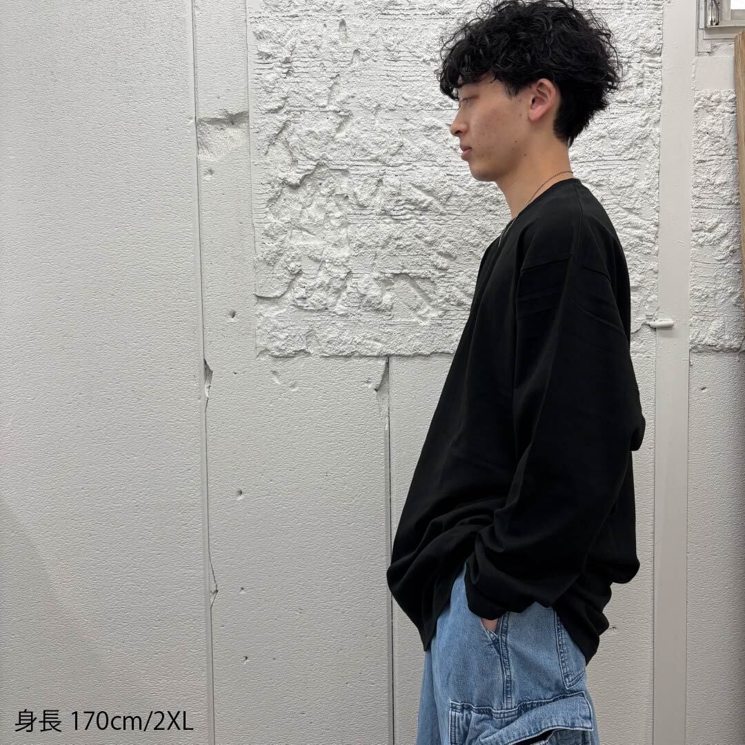 夏は1枚で涼しく秋冬はレイヤードアイテムとしてオールシーズン使えるよう、軽めの5.6オンス生地で仕立てた長袖Tシャツ。袖口リブ無し。